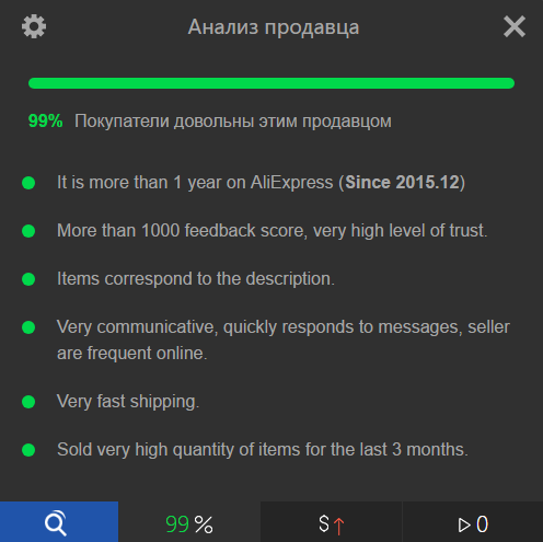 Для последнего можно использовать расширение для Chrome — AliExpress Assistant. Оно также доступно для Firefox, Opera и Яндекс-браузера. Это расширение показывает более детальный рейтинг продавца.