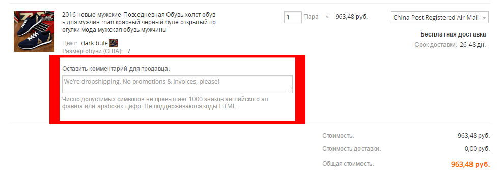 На странице оформления заказа можно добавить сообщение для продавца. Советуем написать сообщение вроде: «We’re dropshipping. No promotions & invoices, please!» Сообщение лучше писать на английском, так как большинство продавцов не знают русского.