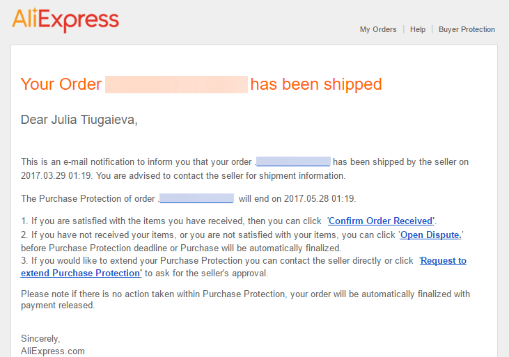 Готово! Осталось только дождаться, пока ваш клиент получит заказ. Когда посылка будет доставлена, AliExpress отправит вам письмо с просьбой подтвердить получение заказа. С этим стоит немного повременить — убедитесь, что клиент получил посылку, и что с товаром все в порядке. Если что-то не так — то вы сможете написать продавцу или открыть спор на AliExpress, чтобы решить проблему.