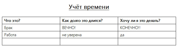 Такой учет можно вести для всего — семьи, работы, ухода за собой. Так вы получаете возможность оценить все ваши обязательства, а также лучше понять, чего вы достигли, на что вы сейчас тратите время, и на что вы хотели бы тратить время в будущем.