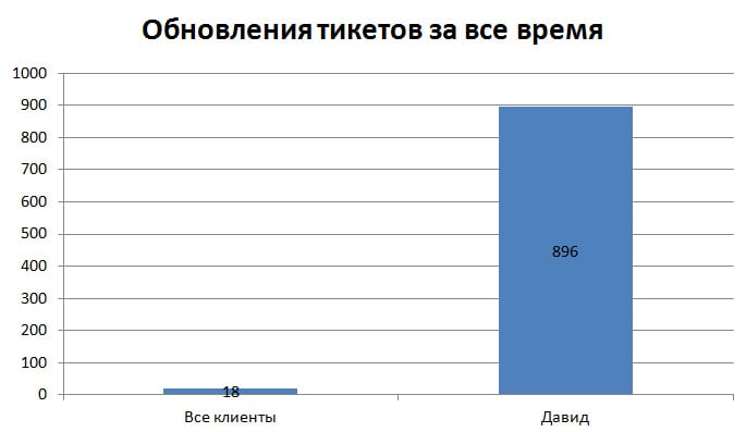 Это также означает, что другие ваши клиенты не получают поддержку так же быстро и качественно, как они этого заслуживают. В случае с Raven Tools, один клиент в среднем взаимодействовал с поддержкой 18 раз. У Давида же взаимодействий было около 900. За всю историю компании он был на четвертом месте среди самых продуктивных отправителей электронных писем.