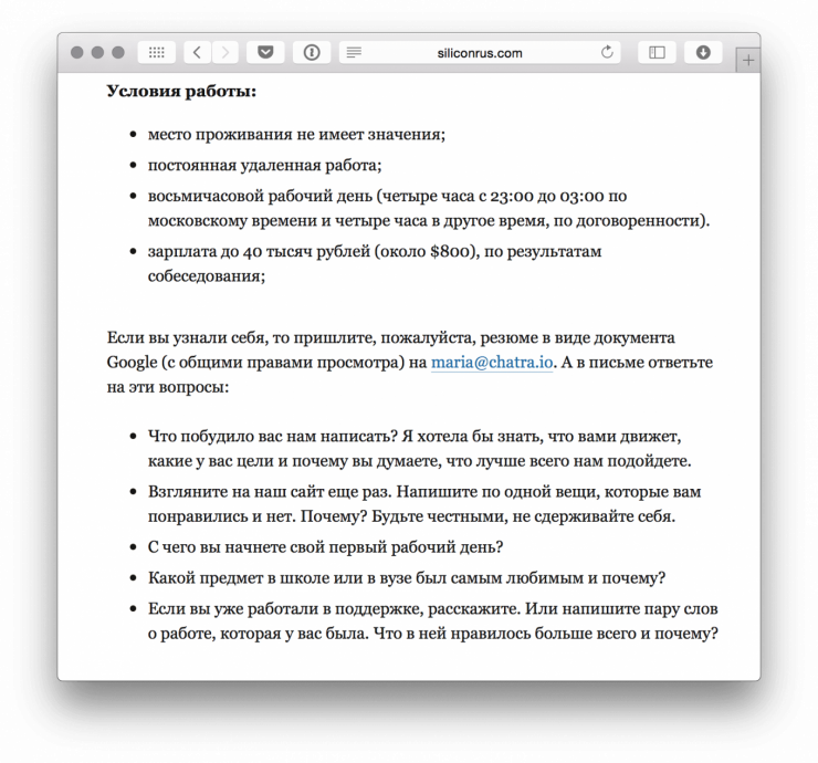 Две недели назад мы искали сотрудника службы поддержки Чатры на ЦП. В описании вакансии мы попросили сделать следующее: