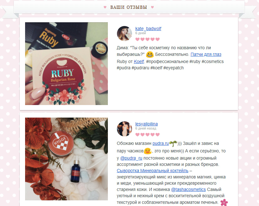 Магазин косметики pudra.ru, например, включают в рассылки отзывы пользователей: