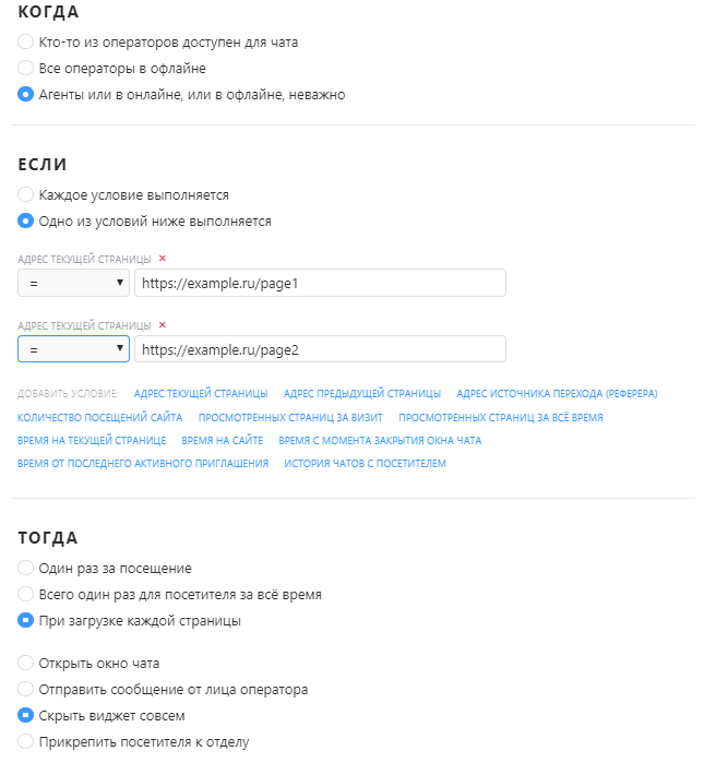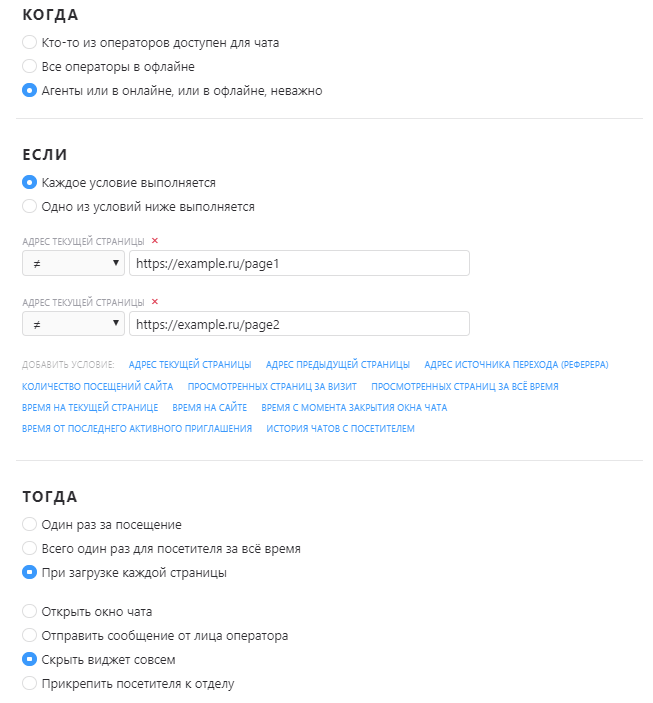 • Кто-то из операторов доступен для чата — действие сработает, когда кто-то из ваших операторов онлайн.