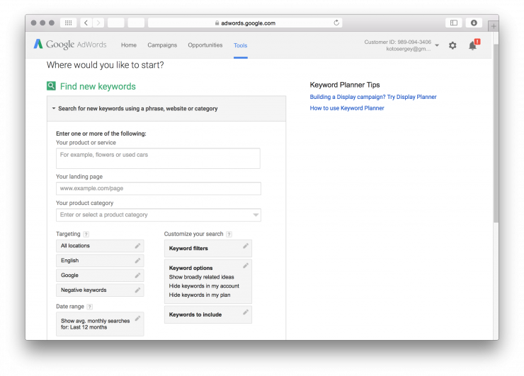 Планировщик ключевых слов от Google. Помогает подобрать правильные ключевики для контекстной рекламы.