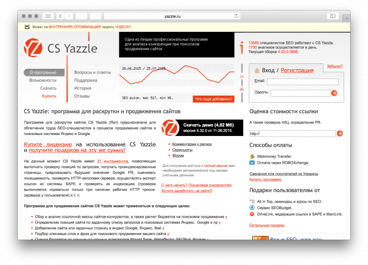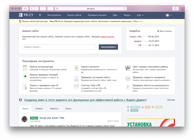 На сайте есть куча всего: набор инструментов, биржа сайтов, форум, справочник. И панель оптимизатора, в которой удобно отслеживать позиции вашего сайта и массу другой статистики о нем. Советуем потратить пару вечеров и внимательно изучить.