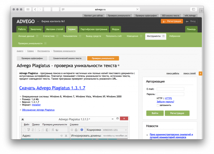 Адвего — это инструмент для проверки уникальности текстов. Пригодится, если вы заказываете SEO-тексты копирайтерам-фрилансерам.