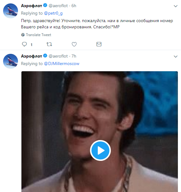 Получить ответы на базовые вопросы можно и в Твиттере. Если заглянуть в раздел “Твиты и ответы” их официального аккаунта @Aeroflot, то можно увидеть, что сотрудники компании активно отвечают клиентам. При этом они используют живой язык, не боятся использовать смайлики и гифки, а в конце каждого твита подписываются своими инициалами.