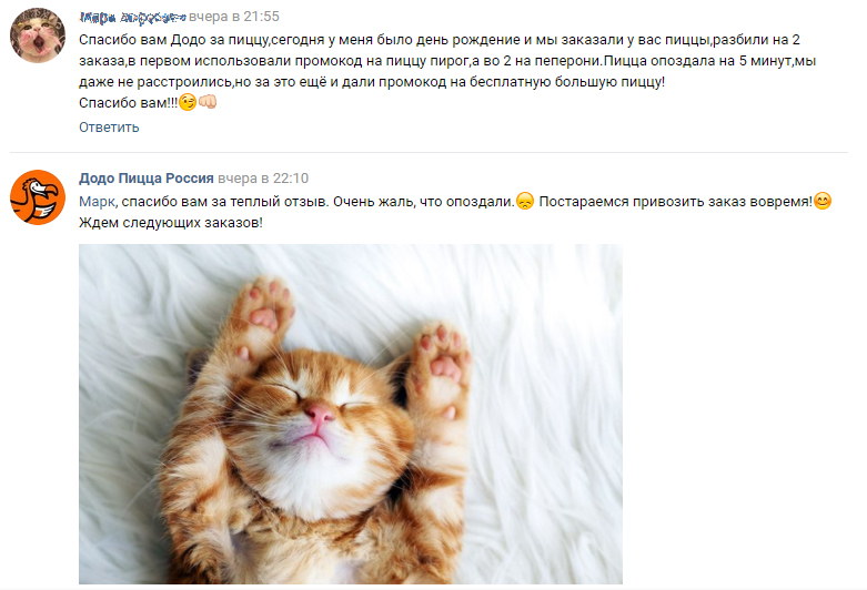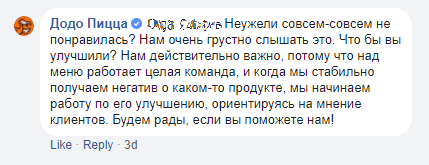 Судя по ответам, компания прислушивается к мнению посетителей. На Фейсбуке одна клиентка в своем отзыве пожаловалась на то, что одна из заказанных пицц показалась ей безвкусной. На что Додо Пицца отреагировали следующим образом: