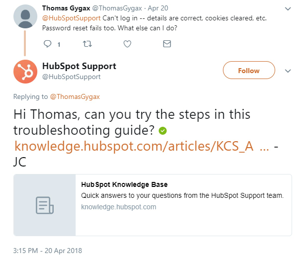 HubSpot — это платформа для автоматизации маркетинга и продаж. Они оказывают отличную поддержку клиентам и делятся советами в своем блоге. Твиттер они тоже не обошли стороной и активно отвечают там на вопросы клиентов с понедельника по пятницу в аккаунте @HubSpotSupport. В каждом ответе они обращаются к клиентам по имени и подписываются в конце своими инициалами.
