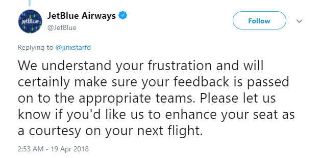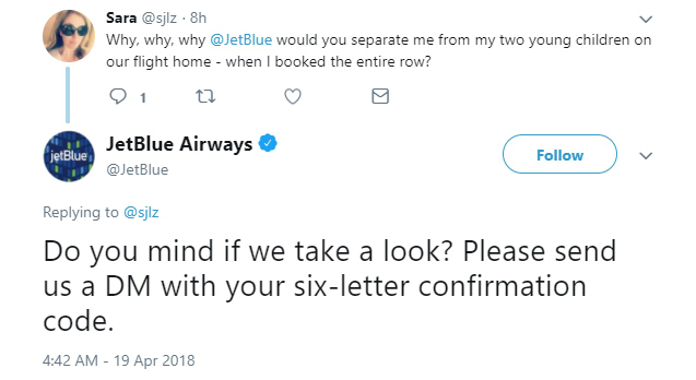 Авиакомпания JetBlue также прославилась своим бережным отношением к клиентам. Помимо телефонов горячей линии и электронной почты, они активно помогают клиентам по большинству вопросов и в Твиттере. Отвечают они обычно очень быстро, так как некоторые вопросы клиентов не требуют отлагательств. Например, когда мать посадили отдельно от ее двух малолетних детей, хотя она забронировала целый ряд.