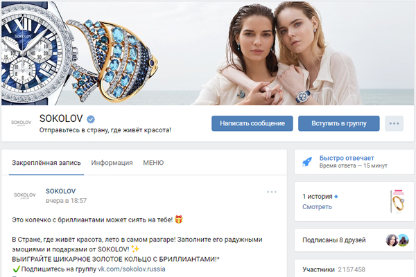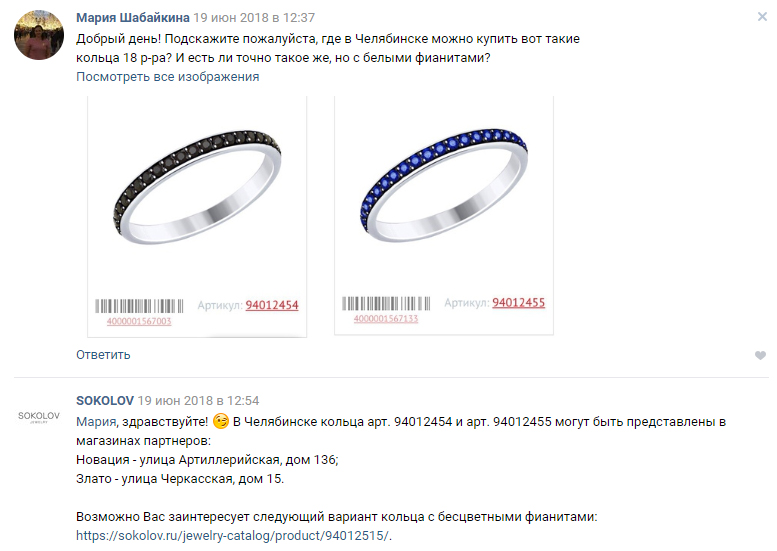 Sokolov — крупнейшая ювелирная компания России. На своем сайте для поддержки клиентов они используют Чатру, но про соцсети они тоже не забывают и активно пользуются Вконтакте.