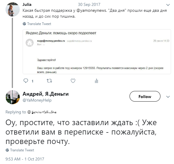 Я сама активно использую Яндекс-кошелек, и в прошлом году я заказала пластиковую карту Яндекс.Денег. Через несколько дней в личном кабинете появился трек-номер для отслеживания письма с картой, но по этому номеру больше двух недель не появлялось никакой информации. Как нелюбитель телефонов, я нашла имейл службы поддержки, отправила сообщение и получила автоматический ответ, что результаты по моему запросу будут максимум через два дня, а скорее всего раньше. Но прошло четыре дня, а ответа все не было. Особо ни на что не рассчитывая, я пожаловалась на скорость поддержки в Твиттере, и вскоре получила ответ. Примерно через неделю карта была уже у меня.