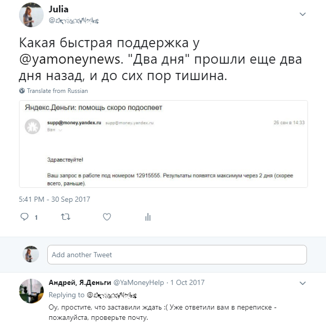 Основные каналы связи с поддержкой Яндекс.Денег — это телефон и электронная почта. Но получить помощь также можно и в Твиттере.