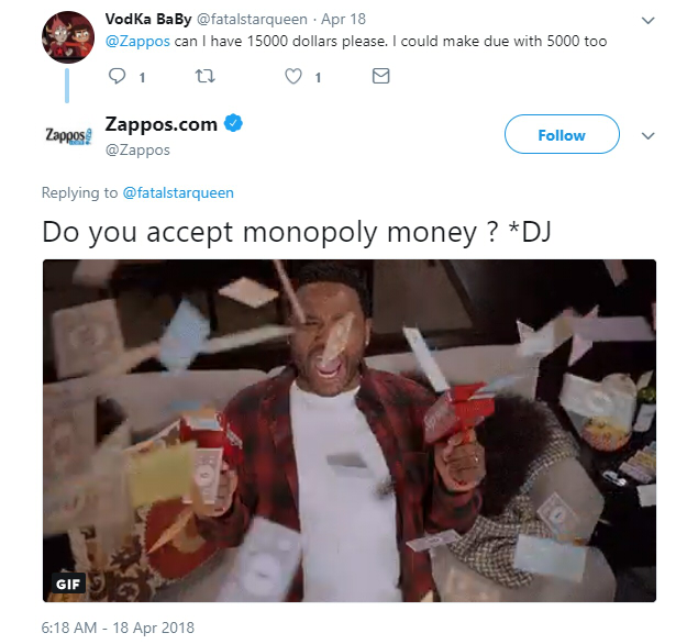 Даже глупые вопросы они не игнорируют и отвечают на них с юмором. Например, когда клиент попросил у Zappos 15 тысяч долларов (но на 5 тысяч он тоже был согласен), Zappos предложили рассчитаться с ним деньгами из “Монополии”.