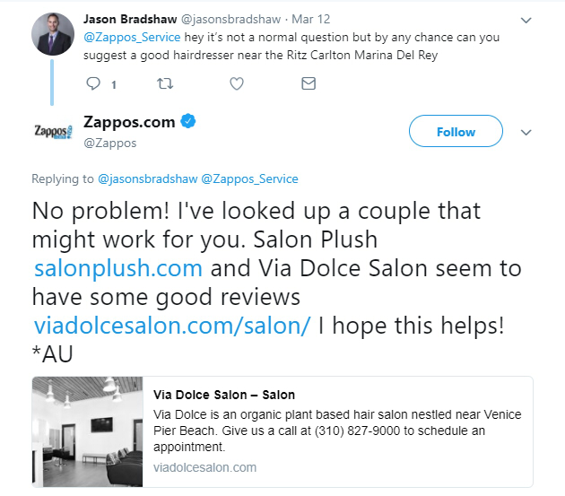Даже если вопрос совсем не связан с их магазином, Zappos в большинстве случаев дадут ответ. На скриншоте ниже клиент попросил порекомендовать ему хорошего парикмахера рядом с его гостиницей, и Zappos не поленились и нашли для него несколько салонов с хорошими отзывами.
